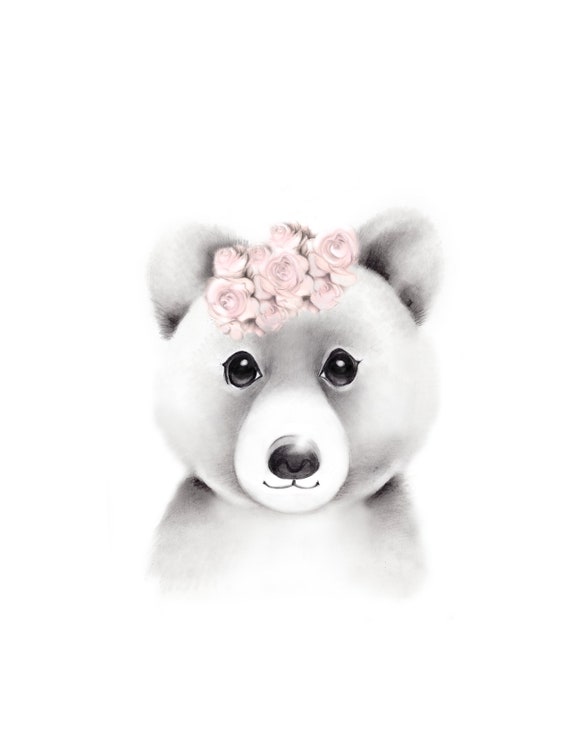 Bear Cub Nursery Art Baby Animal Face Flower Crown Woodland Print Bear Drawing Bear Sketch Portrait Forest Art Girl Floral Art Print